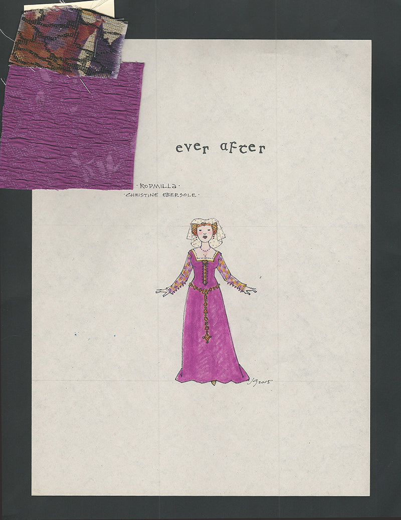 Jess Goldstein's original costume design for EVER AFTER directed by Kathleen Marshall for Paper Mill Playhouse. Magenta dress for Rodmilla, played by Christine Ebersole. Fine ink pen and colored pencil drawing on newsprint paper. Matching fabric swatches (not attached) are also included with the sketch. Dimensions: 9" x 12"