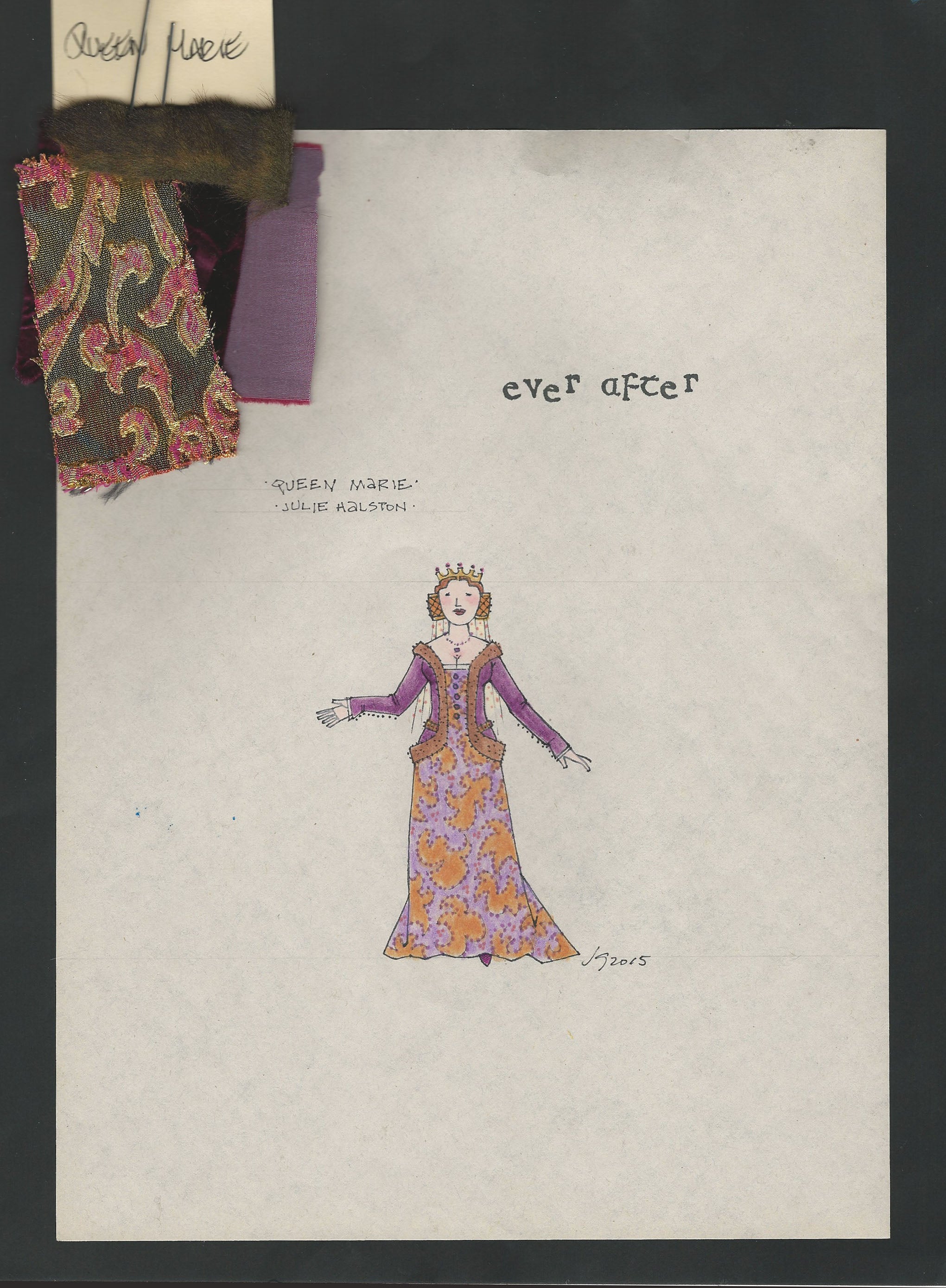 Jess Goldstein's original costume design for EVER AFTER directed by Kathleen Marshall for Paper Mill Playhouse. Costume sketch of Queen Marie played by Julie Halston. Fine ink pen and colored pencil drawing on newsprint paper. Matching fabric swatches (not attached) are also included with the sketch. Dimensions: 9" x 12"