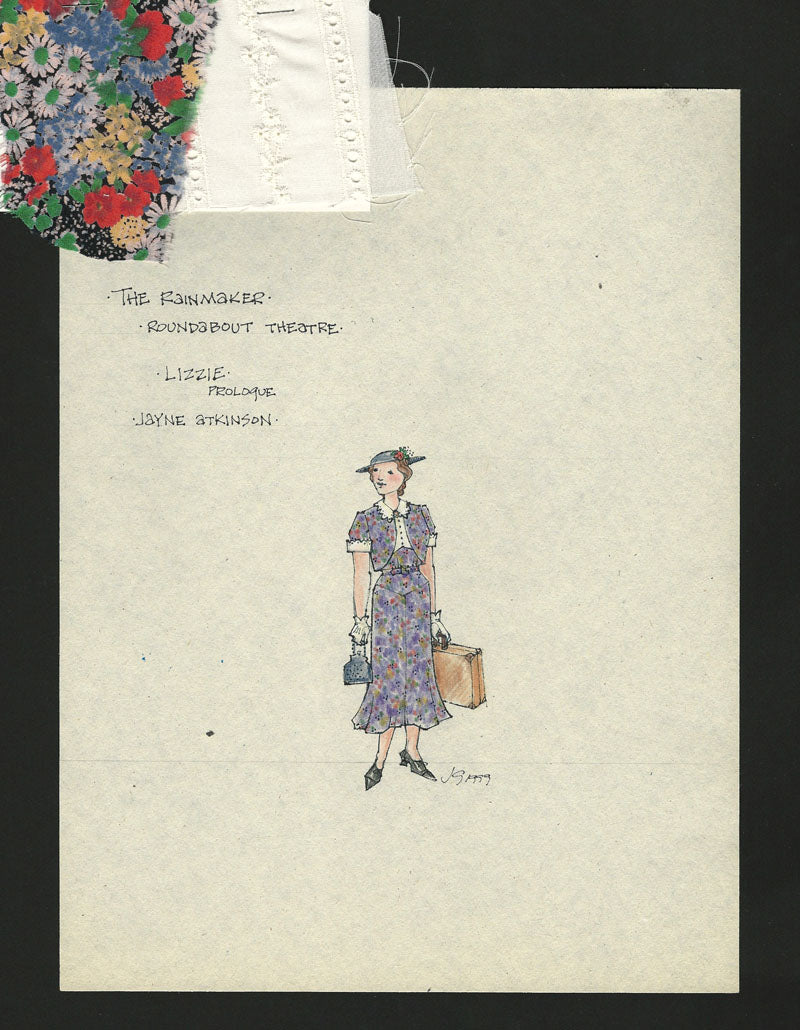 From the 1991 Roundabout Theatre production of Richard Nash's THE RAINMAKER, with Jayne Atkinson and Woody Harrelson; directed by Scott Ellis. Fine ink line and pencil drawing on newsprint paper. Includes backing with swatches (not attached to actual sketch) costume designed by Jess Goldstein.