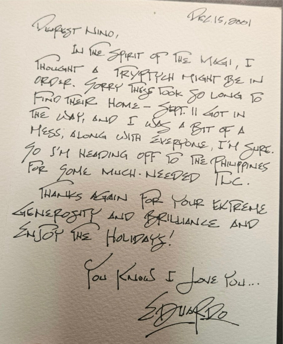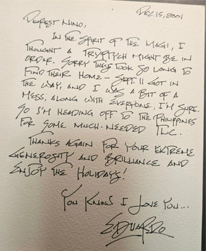 A personal Thank You note from Eduardo Sicangco for work Brian Wolfe and his team did on Broadway Bares (2001).