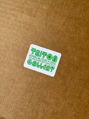 Piece is framed by Triton Gallery with hanging wire hardware on back.